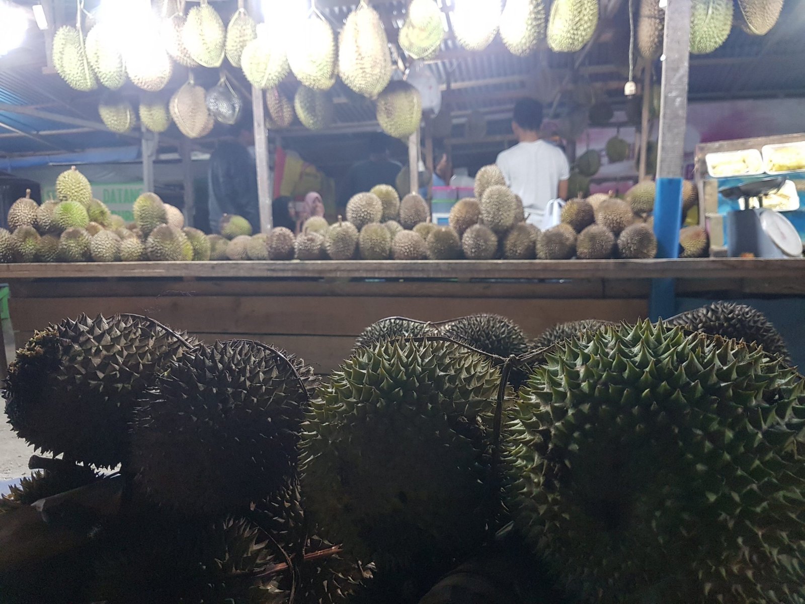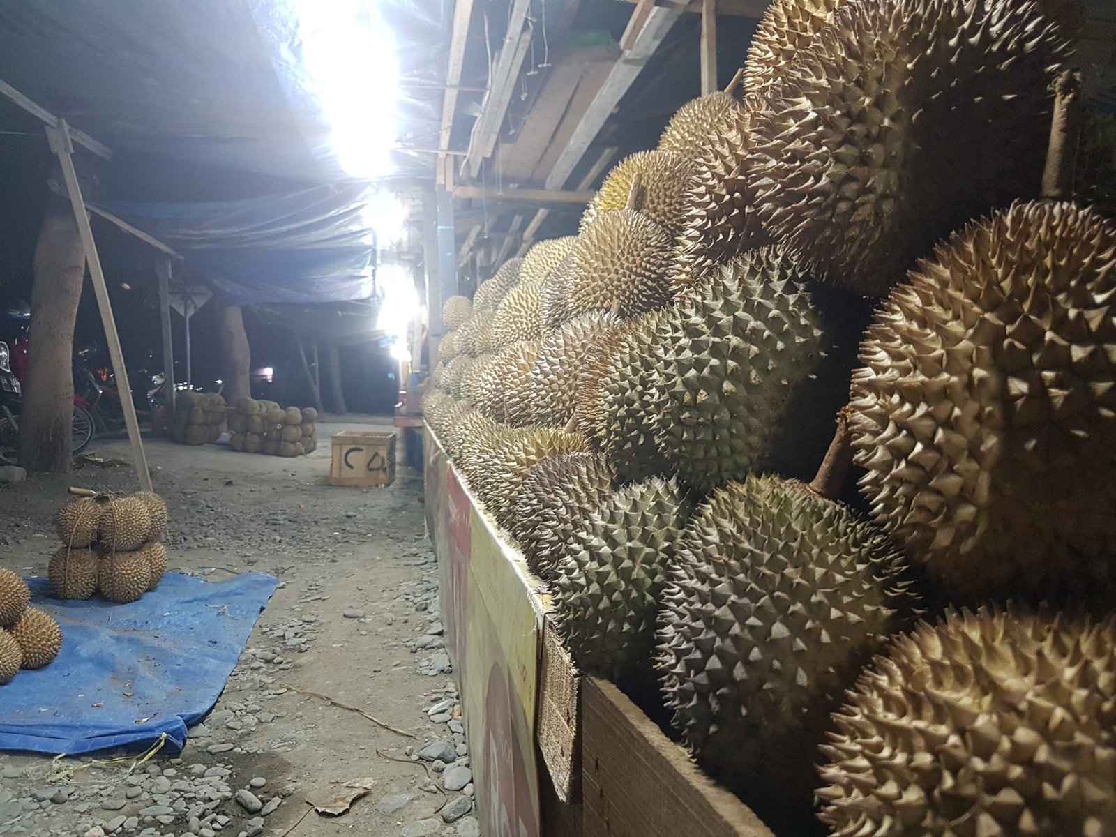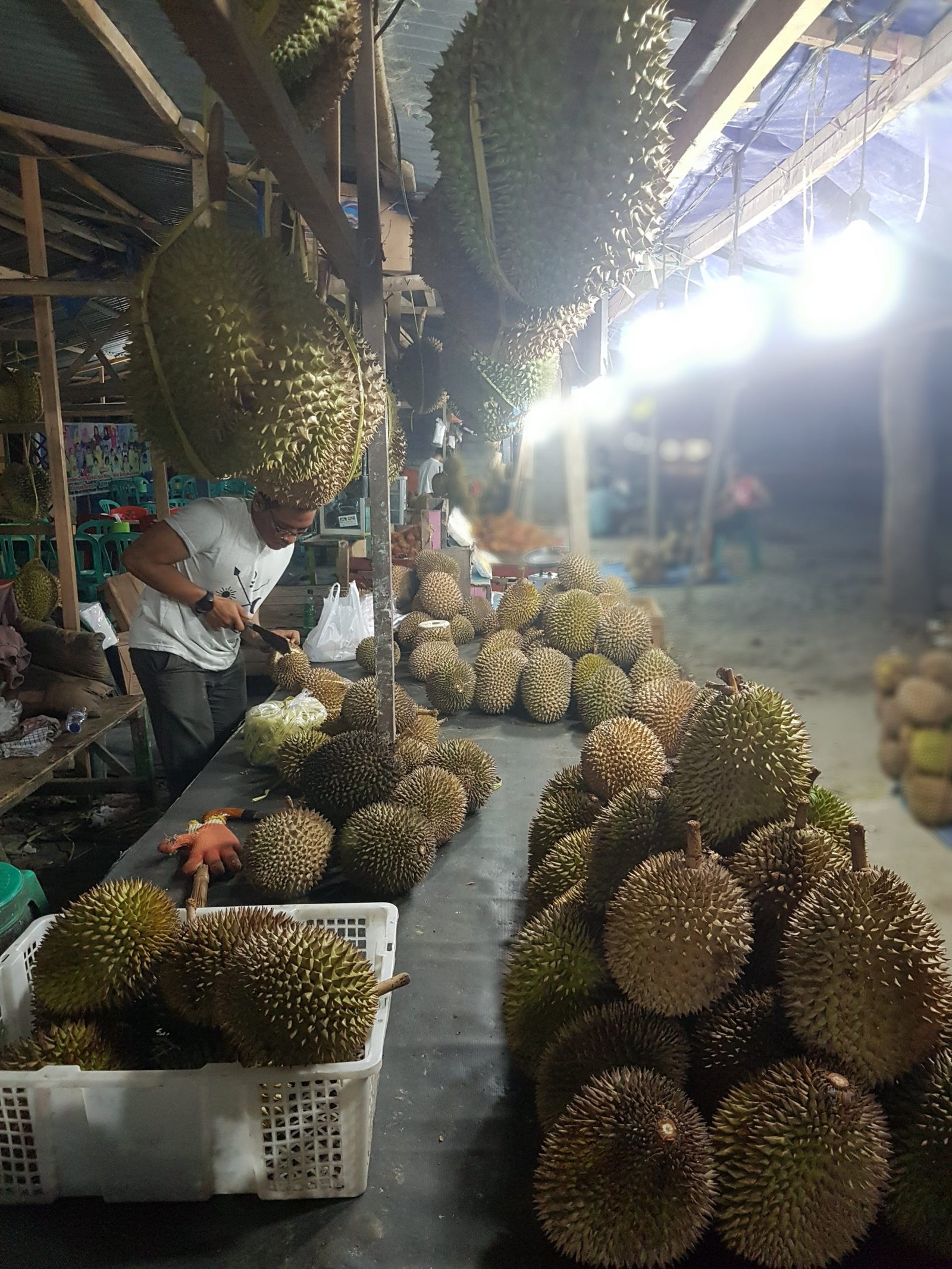 Down by the river, we walk between stacks of gigantic durian, the much coveted king of fruit. They say it smells like death and tastes like heaven. I’ve never quite come to terms with it, but it is a much sought-after treat.
