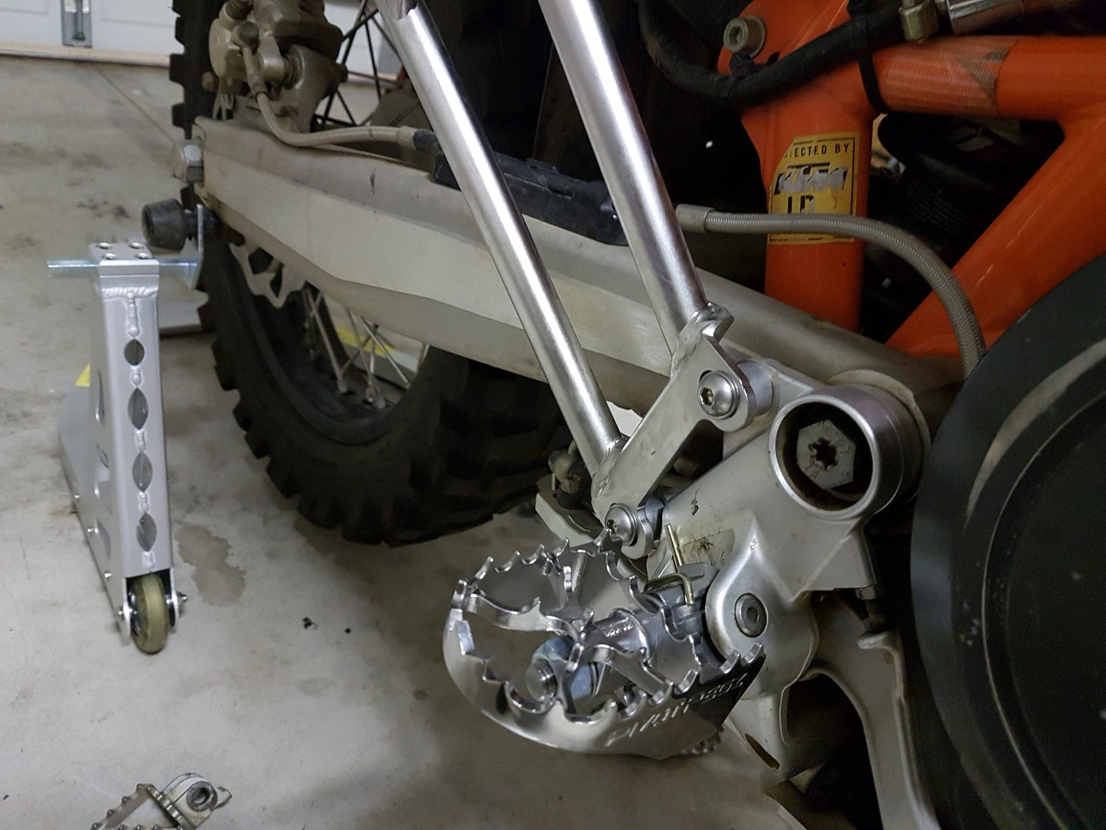 There are the Touratech pannier rails (presumably so shiny because plated in white gold?), and my ferocious-looking Pivot Pegz: