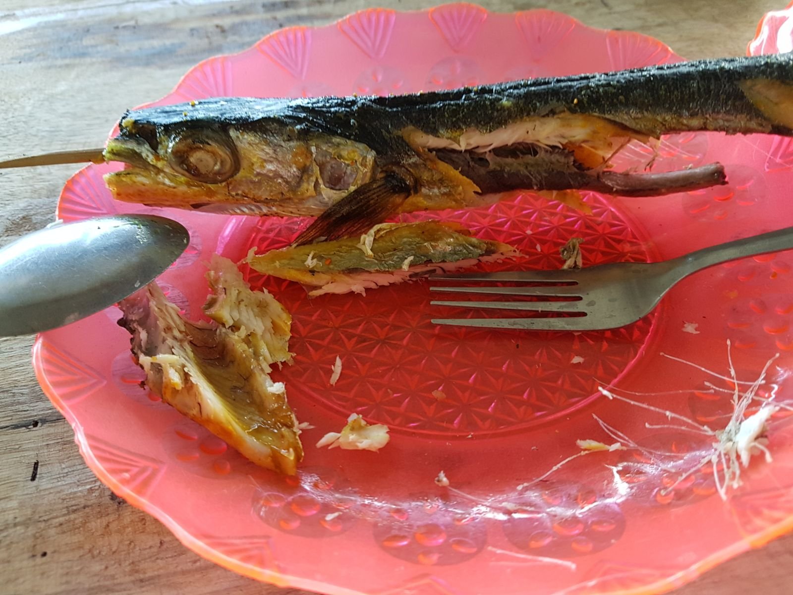 It was another beautiful sunny-bleached day, riding broken tarmac through villages and along the coast. I stopped at bamboo shack perched between the sea and the road and ate a fish as a late lunch. It was tiny – a mackerel – but I sucked the flesh and oil off its little bones. There were packets of cooked white rice in banana leaves and I ate three of them, slicing the leaves with a knife and eating the plan rice with my hands. It may not have been a feast, but there was nothing else.