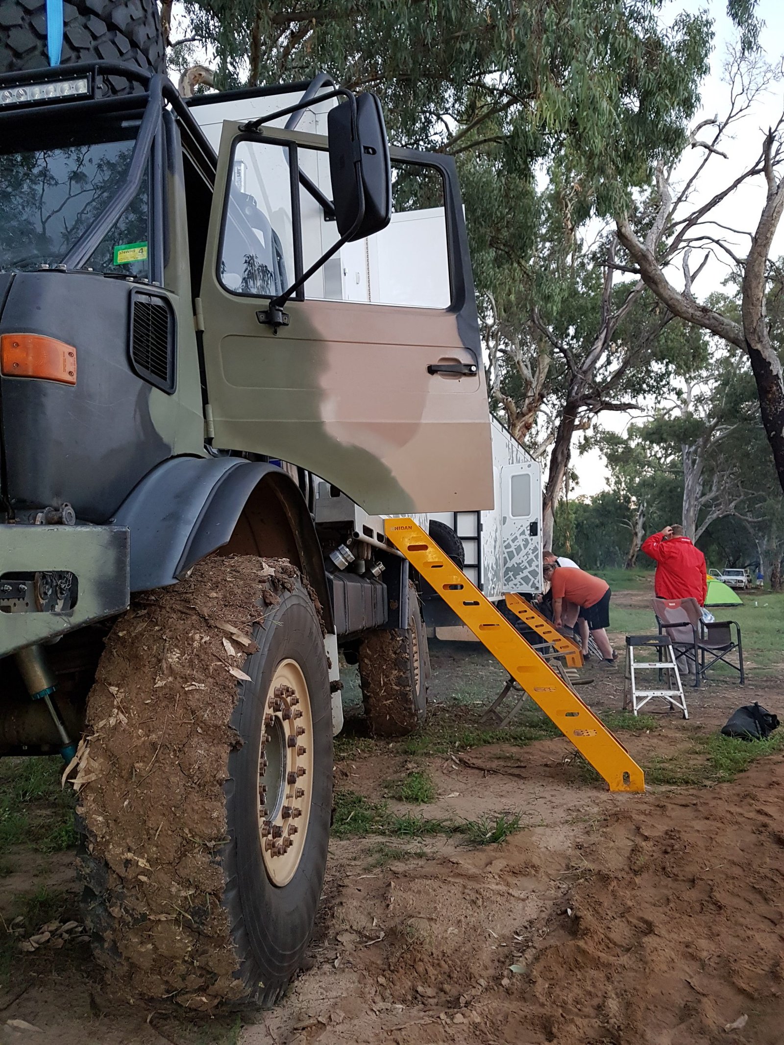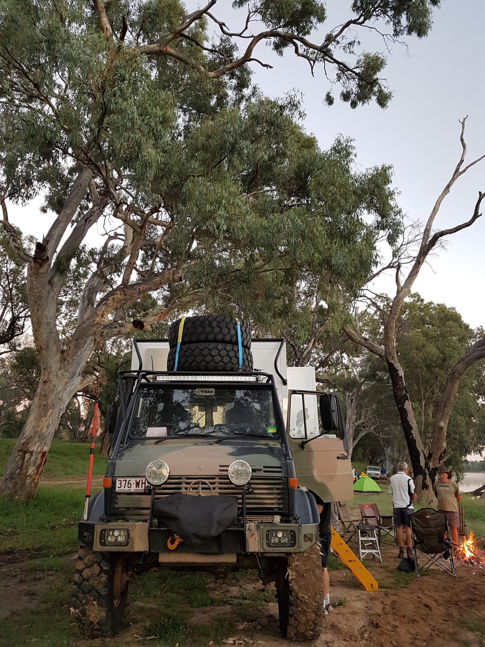 Camped on the other side – well, this mob looked like they were about to invade a small Balkan country. They had a Unimog – a massive six-wheel-drive offroading military vehicle – with a small shiny building on the back of the truck and another small shiny building on an articulated trailer behind it. The wheels were taller than me, and they dwarfed the two Landcruisers towing trailers with boats and quad bikes.